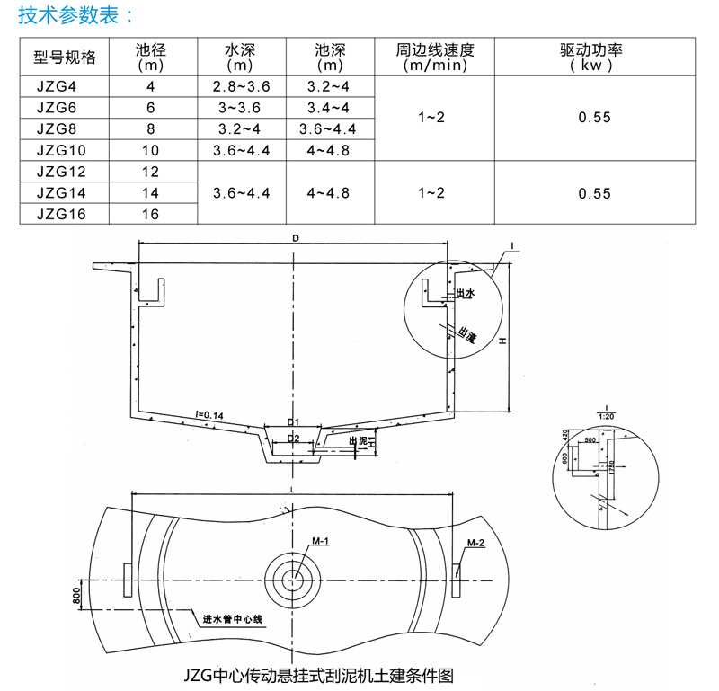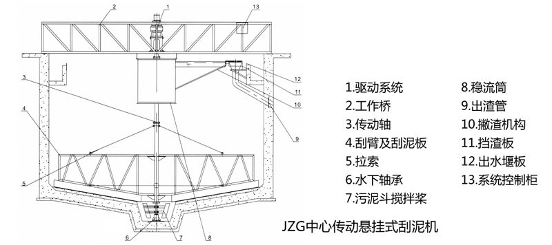 中心傳動刮泥機適用于污水處理廠幅流式沉淀池。其主要功能是將沉降在池底的污泥刮集至積泥坑,以便污泥回流或濃縮脫水。視情況需要,還可以設置池面刮渣機構,收集池面浮渣并通過浮渣漏斗排出池外。