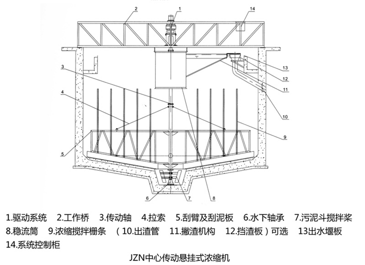 中心傳動垂架式濃縮機(jī)由工作橋(通常半橋)、驅(qū)動裝置(通常采用減速機(jī)、傳遞齒輪、回轉(zhuǎn)軸承組合)、旋轉(zhuǎn)垂架、刮臂及刮泥板、濃縮攪拌柵條、拉索、泥斗攪拌槳、穩(wěn)流筒和電控柜等主件組成。根據(jù)實(shí)際情況和用戶的要求還可以提供出水堰板、撇渣機(jī)構(gòu)、擋渣板和出渣斗等附件。